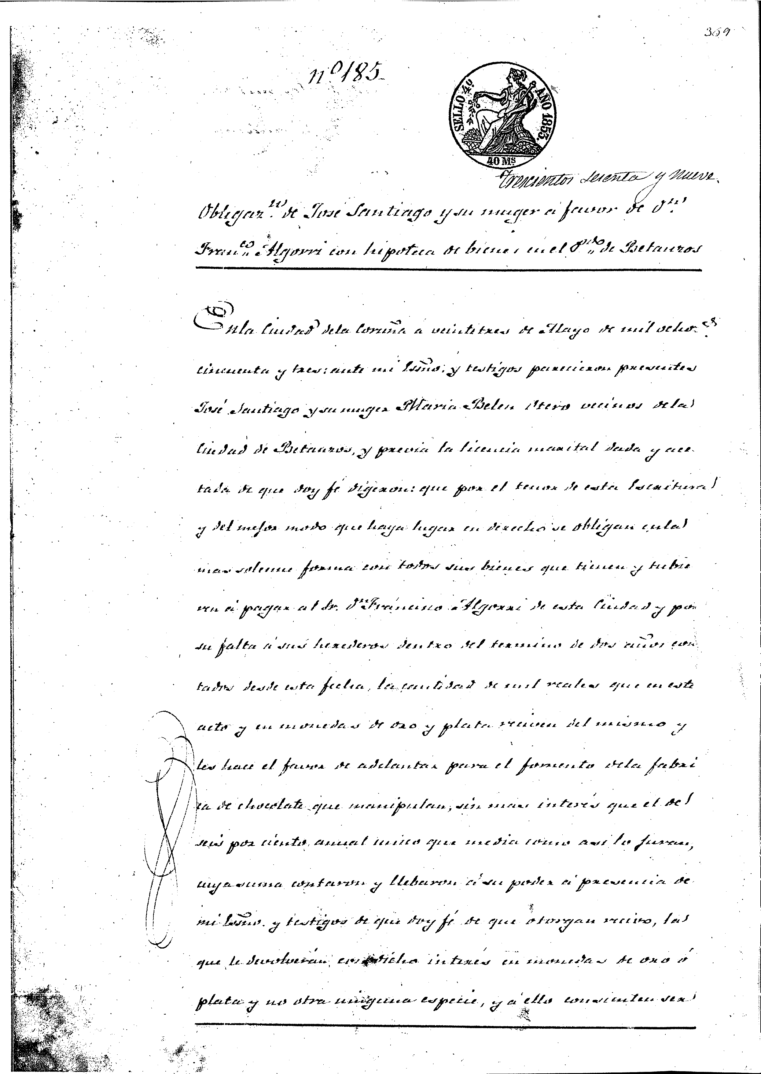 » En la Ciudad de la Coruña a veintitres de Mayo de mil ochocºs. cincuenta y tres: ante mi Essno., y testigos parecieron presentes José Santiago y su muger Maria Belen Otero vecinos de la Ciudad de Betanzos, y … dijeron: que por el tenor de esta Escritura… se obligan… con todos sus bienes que tienen y tubieren á pagar al Sr. Dn Francisco Algorri de esta Ciudad y por su falta á sus herederos dentro del termino de dos años contados desde esta fecha la cantidad de mil reales que en este acto y en monedas de oro y plata reciven del mismo y les hace el favor de adelantar para el fomento de la fabrica de chocolate que manipulan, sin mas interes que el del seis por ciento anual… Y a la seguridad de los mil reales sus intereses, y de las costas y gastos que por omision causaren, ademas de la obligacion general constituida hipotecan… la Casa en que abitan sita en la Calle de los Sombrereros de dha Ciudad de Betanzos señalada con el numº. tres, compuesta de dos pisos con su cortijo y otras oficinas que confina por Norte con otra de Dn Juan Paez, Poniente en otra de Jacinto Baleiro, Lebante en bodega de Dn Jacinto do Rego, y Vendabal con dha Calle, pensional de los hereds. de Dn Eugenio Martinez á quienes paga nueve rs. anuales, segun la adquirieron de Antonio Correa y sus hijos por Essra. de cinco de Marzo de mil ochozºs cuarenta y siete por ante el Essno. Dn. Ramon Maria Gonzalez, Y finalmente hipotecan una pieza de tierra labradia y viña al sitio de la Angustia en Sn. Pedro das Viñas, cavida diez jornales y dos tercios… que adquirio… por Essra. de veinte de Enero del año ultimo por ante el Essno. Dn Agustin Nuñez… Asi lo digeron y otorgaron, firma el Santiago y el prestamista, no lo hace la muger de aquel por no saber, a su ruego un testigo de los presentes que lo son Francº. José Garcia vezº. de Sn. Silbestre de Veiga, Dn Juan José Novoa, y Dn Juan Salgueiro que lo son de esta Ciudad; de lo cual y conocimiento yo Essno. doy fé… [Firmado]. Jose Santiago, Francº Algorri, testigo y Arruego Francº. José García. [Rúbricas]. Antemi. [Firmado]. Ldo. Ruperto Suarez. [Rúbrica].». (Archivo Notarial de La Coruña. Protocolo 9.697, escritura número 185, folio 369, del escribano Ruperto Suárez del número de La Coruña).