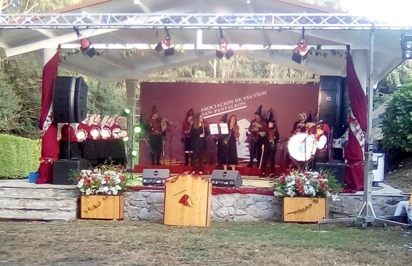 Como broche del evento intervino la Banda de Gaitas San Pantaleón, la más antigua de las tres habida cuenta que data de 1986, y nacida al abrigo de la Asociación de Vecinos como una de sus actividades culturales más relevantes. Esta dirigida por Dani López y cuenta con más de medio centenar de alumnos, que cuentan desde los siete a los setenta y nueve años de edad. En los años noventa del pasado siglo realizó multitud de salidas por toda la geografía gallega como parte de la “Liga Galega de Bandas de Gaitas”, periodo en el que obtuvieron varios y calificados premios. Actuaron por distintas ciudades y poblaciones de Portugal, además del territorio nacional e islas de Baleares y Canarias, e incluso en conocidos y populares programas de la T.V.G. En la actualidad han incorporado a sus conciertos otros instrumentos como el piano, saxofón, clarinete o timbales, sin olvidar la destacada sección de pandereteras que con sus típicos cánticos, tañidos y panderos hacen las delicias de todos y en particular de los amantes de nuestra cultura popular. Al finalizar su actuación habían transcurrido más de dos horas de embeleso, y el apego del público se tradujo en una imparable lluvia de aplausos con prolongación hasta que los componentes de las tres agrupaciones abandonaron el Parque del Hormeiro.