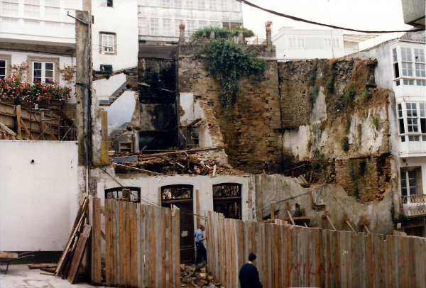 “…Una casa con su alto, salido y almena, sita en la calle de los plateros de esta dicha Ciudad, que confina al poniente con Dn. Juan San Martín, Trabesio con la en que vive Dn. Cosme Antolin Serrano, mediodía con la Almena y por el Norte con la Calle, cuya casa se halla enteramente deteriorada y con especialidad la pared medianil dela del Dn Cosme, según por menor resulta del estado judicial que se ha tomado cuando la propia señora entro en posesion; por lo que y dimanado de las circunstancias, no puede reunir medios pª. reedificarla y delibero aforarla a sugeto que lo verificase presentandose al yntento el Dn. Cosme Antolin que se combino en dar por ella anualmente trescientos rrs y treinta mrs y ademas satisfacer a los propios de le espresada Ciudad ocho rs y treynta mrs asi bien cada año…”. (Archivo Municipal de Betanzos. Caja 5.799, folio 84, sin catalogar).