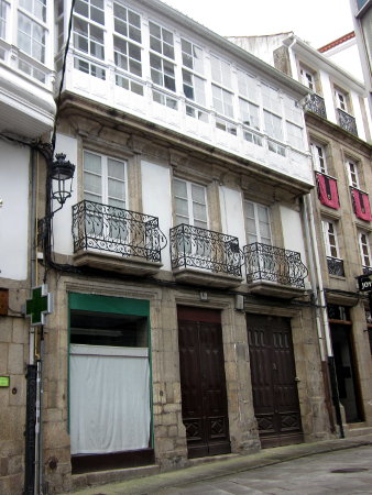 “…una Casa que el otorgte tiene, y esta Sita en la Calle de los Plateros de esta rreferda Ciudad compuesta de Alto con su Balcon que dice a dha Calle por donde tiene su entrada, Dos Ventanas, un Quarto Arrimado a la Pared Medianil de la Casa dela Viuda y heros. de Antonio Sanchez Couceiro, Cerrado con su Puerta pecho y llave, Cocina con Chiminea, y junto a ella una Puerta que sale para la Almena y Salido correspondie a la misma Casa, que se halla Losado para el Blanqueo de la Cera que travaja y en que Comercia dho Nobo, Fayado y piso Correspondiente, y en este otra Dispensa con su Puerta y Zerradura, dos tiendas en la entrada que dice a la expuesta Calle, ygualmte Cerradas, Cavalleriza y Bodega Separada y cerrada con su Puerta, pecho, y llave, todo ello compuesto y rreparado delo necesario, Segun confina por la frontera, Aire Norueste o travesio con la citada Calle de los Plateros, y principio de la nombrada Rua traviesa, por la de arriba que dice al Vendaval con la de la Viuda y heros del expresdo Antonio Sanchez Couzro, y por la de abajo Aire Nordes con Casa de los de Dn Joaquín Tenrreiro que vive Dn> Juan Pereira Boticario, bien conocida y del otorgte. y de sus Vinculos y Maiorazgos…”. (Archivo Notarial de La Coruña. Protocolo 2.127, folio 32, del escribano Manuel José Couceiro del número de Betanzos).