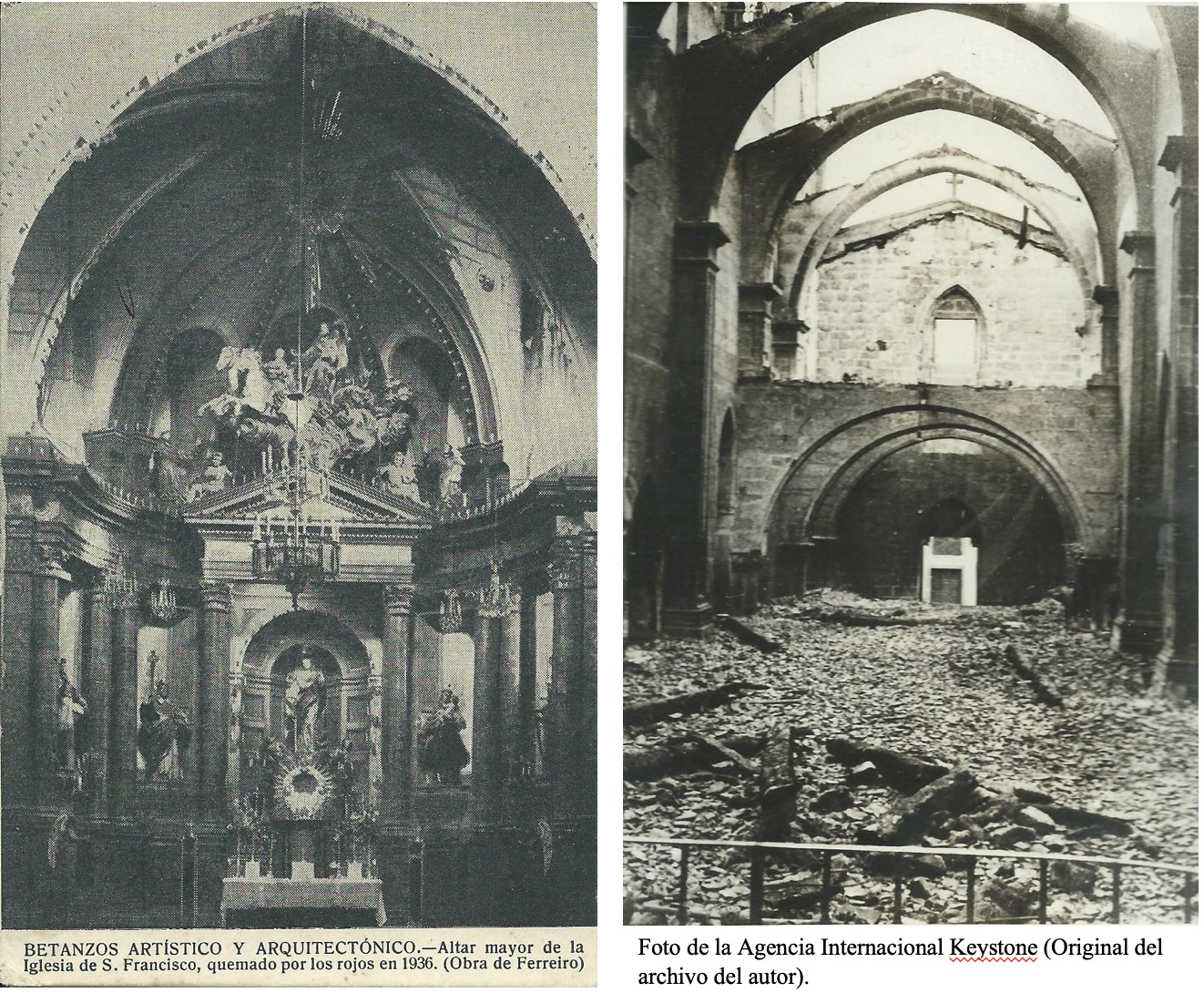 Presentamos una tarjeta postal del retablo del Altar Mayor de la iglesia de San Francisco de Betanzos, en el que se hace referencia a la época en que este templo y convento de frailes menores fue incendiado, y una fotografía de la agencia internacional Keystone que lo muestra reducido a cenizas. Este terrible suceso tuvo lugar el miércoles 22 de julio de 1936 a cargo de exaltados del Frente Popular, de ahí el pie que proclama su desaparición (Archivo del autor). Un texto que alude a los rojos como eran conocidos y según consta en testimonios de absoluta solvencia, en relación con las represalias que padecieron en periodo tan nefasto de nuestra Historia, como el que figura en una epistolar fechada en Betanzos el 21 de noviembre de 1938, en la que se pone en conocimiento del destinatario que “… El sábado fué fusilado el pistolero y escopetero =Caga no pino= murió con el puño en alto y deseando qe Rusia viva muchos años (lo mismo qe Tomás da Torre) y luego, mejor dicho antes, decían qe eran muy buenos chicos qe nunca habían roto un plato…”, en referencia a don Celestino Veiga Álvarez ajusticiado el 19 de noviembre de 1938 y al ex-alcalde don Tomás López da Torre (Archivo del autor). Un relato desolador, se mire por donde se mire.