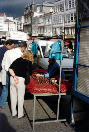 En las ferias del mes de noviembre en Betanzos, la antigua y conocida Feria Franca que se viene celebrando desde la Edad Media, posiblemente sea la castaña el producto estrella que se viene ofertando desde tiempo inmemorial como propio de la recolección de otoño. Nos dice Covarruvias en su diccionario que «…Las castañas son el sustento de algunas tierras montañosas, no sólo de los brutos pero también de los hombres; y estando seca las muelen y hacen pan dellas. Tiénense por regalo, estando asadas o cocidas… Las castañas apiladas son las que se han enjugado del todo, habiéndolas mondado y estando muy secas, de las cuales se hacen algunos guisados y potajes para los dias de pescado…» (Tesoro de la Lengua Castellana o Española, Madrid 1611).